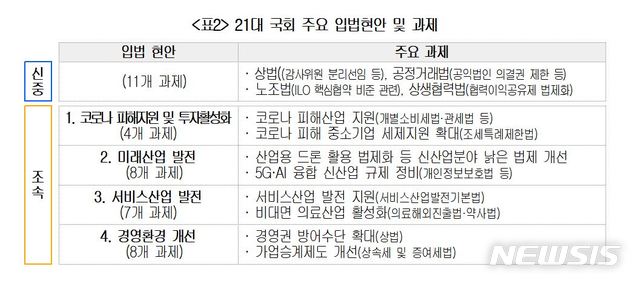 상의는 리포트에서 기업경영에 중대한 영향이 예상되는 11개 신중논의 과제(13개 법안)를 선별해 경제계 의견과 대안을 제시했다. 이와 함께 ▲코로나 피해지원 및 투자활성화 ▲미래산업 발전 ▲서비스산업 발전 ▲기업경영환경 개선 등 4대 부문 27개 조속입법과제(41개 법안)에 대한 의견도 전달했다.