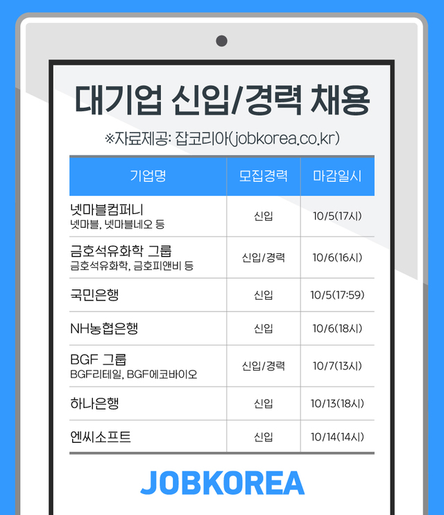 5일 잡코리아에 따르면, 특히 금융권 신입사원 채용이 추석연휴 전후로 이어지고 있다. 국내 5대은행 중 우리은행과 신한은행의 신입사원 모집이 9월중순 마감됐고, 이어 ▲국민은행이 10월5일 ▲NH농협은행이 10월6일 ▲하나은행이 10월13일까지 신입사원을 모집 하고 있다. 게임업계에서 취준생들의 높은 선호도를 보이고 있는 ▲넷마블컴퍼니(~10/5)와 ▲엔씨소프트(~10/14)도 신입사원을 채용 중이다. 실제 넷마블컴퍼니의 개발사 넷마블은 게임잡의 ‘취준생이 선호하는 게임회사 조사(2019)’에서 3위를, 엔씨소프트는 4위를 차지한 바 있다. 이외에도 ▲금호석유화학그룹(~10/6)과 ▲BGF그룹(~10/7)이 신입 및 경력직 공채를 진행하고 있다..