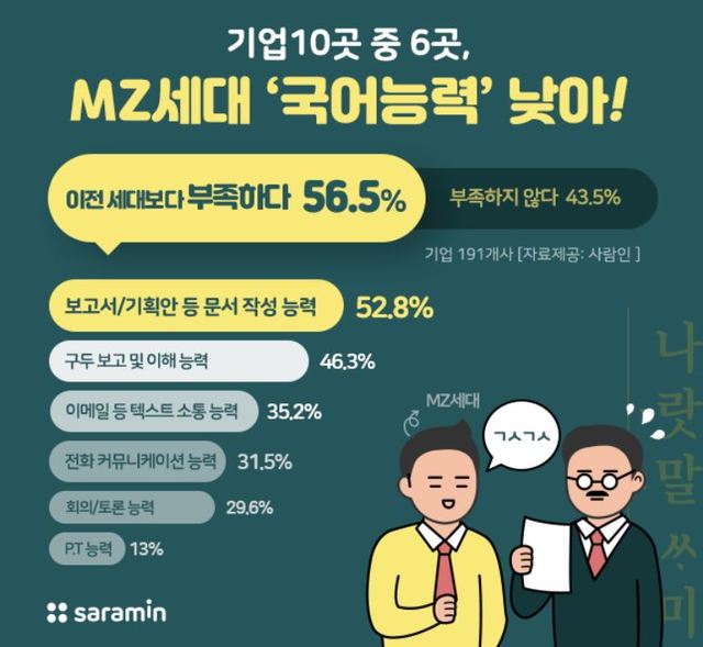 구인구직 매칭 플랫폼 사람인(대표 김용환)이 한글날을 앞두고 기업 191개사를 대상으로 ‘MZ세대 직원의 국어 능력’을 조사한 결과, 56.5%가 이들의 국어 능력이 이전 세대보다 ‘부족하다’고 밝혔다.