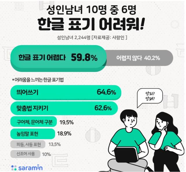 구인구직 매칭 플랫폼 사람인(대표 김용환)이 성인남녀 2244명을 대상으로 ‘맞춤법 등 한글 표기에 어려움을 느끼는지 여부’를 조사한 결과, 59.8%가 ‘어려움을 느낀다’고 답했다.