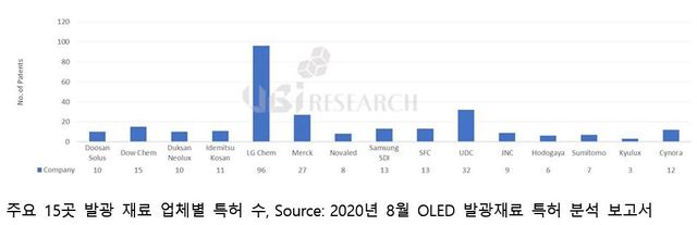LG화학은 유비리서치가 5월에 발간한 ‘2020 OLED 발광재료 보고서’에서도 2017년부터 2019년까지 발광재료 관련 특허를 가장 많이 공개하고 등록한 업체로 선정된 바 있다. LG화학은 현재 삼성디스플레이에 전자수송층(ETL) 재료를 공급하고 있으며, LG 디스플레이에 모바일과 TV용으로 다수의 공통층과 발광층 재료를 공급하고 있다.