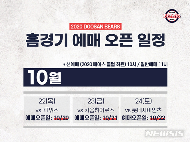 2020 베어스클럽 회원은 오전 10시부터 두산 베어스 홈페이지에서 예매할 수 있다.
