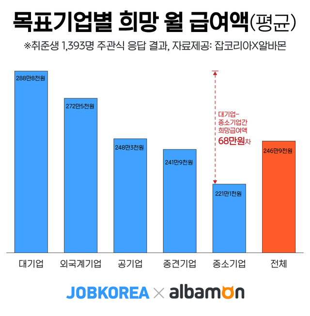 중소기업 목표 취준생 희망급여 월 221만1천원… 대기업보다 약 68만원↓