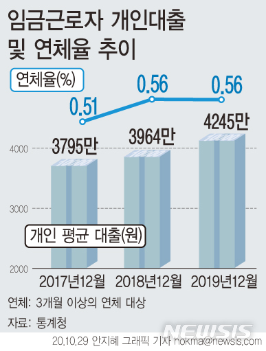 통계청이 29일 발표한 '2019년 일자리행정통계 임금근로자 부채'에 따르면 지난해 말 기준으로 임금근로자의 평균 대출은 4245만원으로 전년(3964만원)보다 281만원(7.1%) 증가했다.