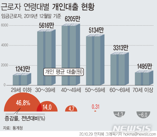 [세종=뉴시스] 박영주 기자 = 지난해 말 기준 월급쟁이들이 평균 4245만원의 빚을 지고 있는 것으로 나타났다. 빚이 가장 많은 연령대는 40대로 6000만원을 넘어섰으며 청년층(29세 이하) 대출증가율도 50%에 육박했다.