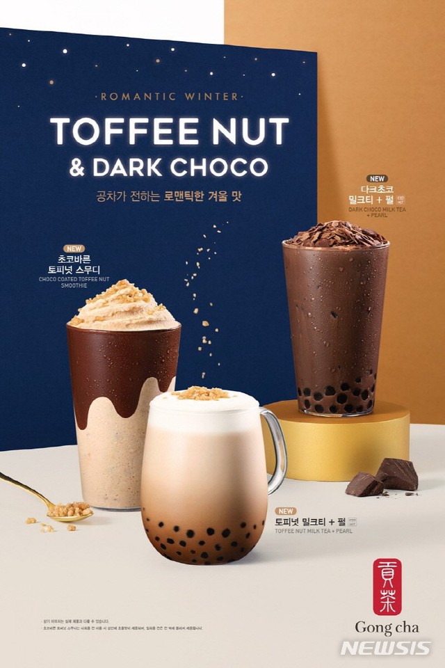 티(Tea) 음료 전문 브랜드 공차코리아는 겨울 메뉴로 달콤 고소한 '토피넛 음료 2종'과 진하고 깊은 풍미의 '다크초코 1종'을 선보인다. 이번 겨울 시즌 메뉴는 '로맨틱한 겨울 맛'을 테마로 삼았다.