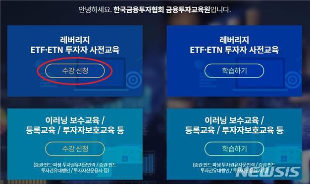 강의는 금융투자교육원이 진행하는 '한눈에 알아보는 레버리지 ETP가이드'다. 교육원 홈페이지에서 1시간 동안 시청하면 된다. 향후 이수번호를 거래하는 증권사에 제시하면 된다.