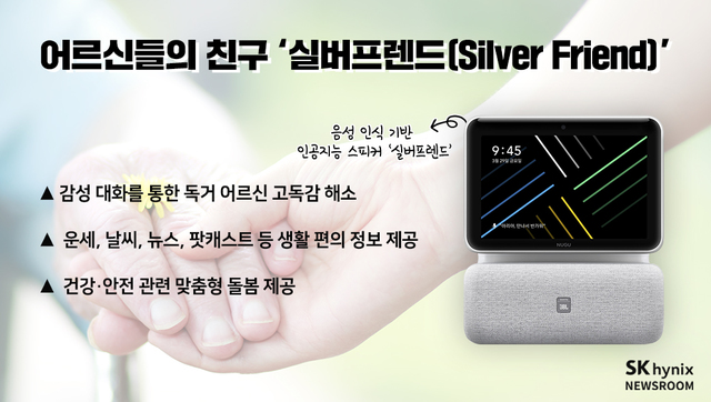 박 담당은 “실버프렌드 프로그램은 SK하이닉스의 기획·운영과 보건복지부, 독거노인종합지원센터, 소방청 등 정부 기관 협력을 통해 감성 친화적인 AI 기기를 제공함으로써 독거 어르신의 생활을 즉시 개선하는 ICT 기반 지원체계를 구축하는 데 목적이 있다"며 "실제로 실버프렌드는 현재 어르신들의 외로움과 일상 속 불편함을 개선함으로써 훌륭한 라이프 파트너(Life Partner)의 역할을 충실히 수행하고 있고, 노인 돌봄 기지국과 소방청에 기기 사용 데이터를 실시간으로 전달해 효과적인 응급상황 대응에도 기여하고 있다"고 말했다.