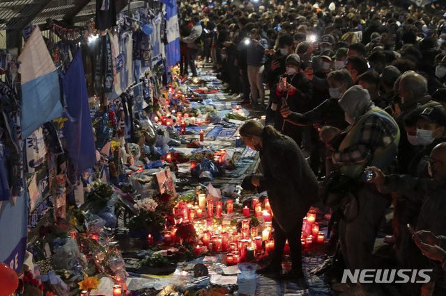 [나폴리( 이탈리아)= AP/뉴시스] 나폴리의 상파울루 축구경기장 앞에 설치된 마라도나의 추모의 장소에 26일 그의 사진과 수많은 촛불이 놓여져있다.