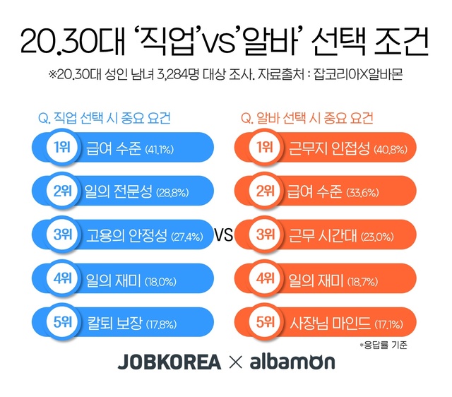 ‘직업’ 선택 기준 1위, 급여 vs ‘알바’ 선택 기준 1위, 근무지 인접성