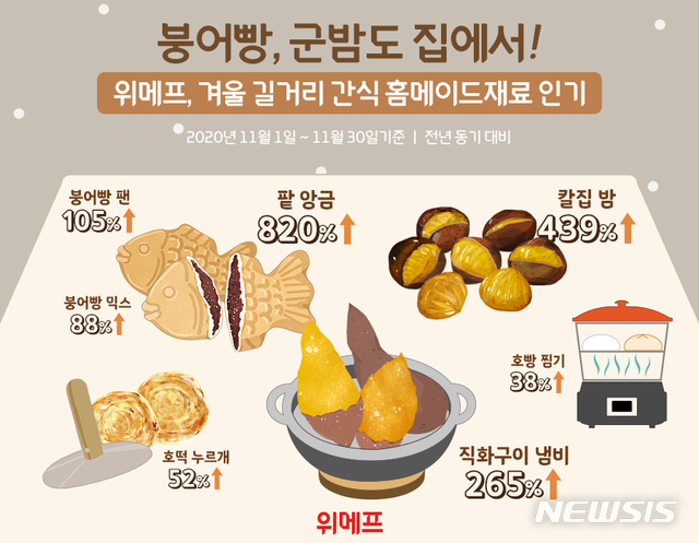 2일 위메프에 따르면 11월 한 달간 간식 관련 매출을 분석한 결과 붕어빵, 군밤, 군고구마 등 겨울철 대표 길거리 간식을 직접 만들 수 있는 재료의 판매가 전년 동기 대비 크게 늘었다.