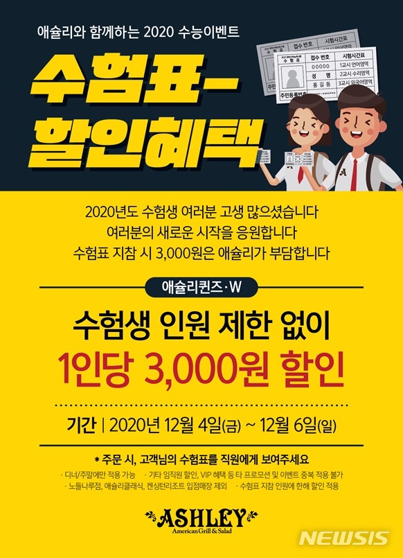 이랜드이츠는 애슐리를 이용하는 수험생 1인당 3000원의 할인 혜택을 4일부터 6일까지 제공하기로 했다. 프로모션은 디너와 주말에만 적용 가능하다.