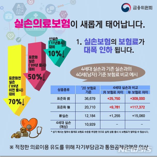 금융위는 특히 새로운 상품은 자기부담금 수준과 통원 공제금액 인상의 효과로 보험료가 기존 상품보다 대폭 낮아질 것으로 보고 있다.