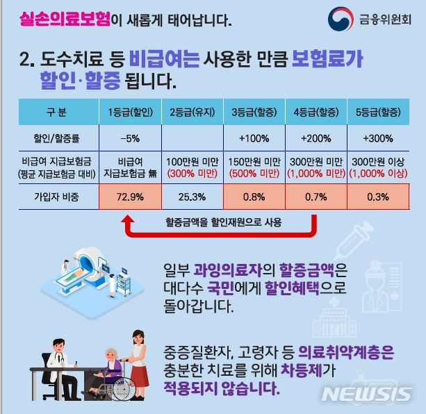 권대영 금융위 금융산업국장은 이날 브리핑에서 "보험료 상승의 주원인인 비급여 전체를 특약으로 분리하고 보험료 차등제를 도입해 가입자 간 보험료 부담 형평성을 제고했다"며 "비급여 이용에 따라 보험료가 올라가고 내려가게 설계하고 재가입 주기도 단축·조정했다"고 부연했다.