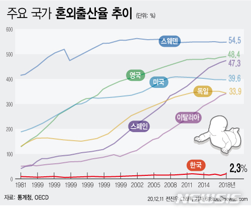 11일 통계청이 발표한 '한국의 사회동향 2020'에 따르면 작년 한국의 혼외출생아는 6974명이었다. 혼외출산율은 2.3%로 역대 최고치를 나타냈다.하지만 서구 국가들(2018년 기준)을 보면 프랑스 60.4%, 스웨덴 54.5%, 영국 48.4%, 스페인 47.3%, 미국 39.6%, 이탈리아 34.0%, 독일 33.9% 등으로 우리보다 월등히 높다.