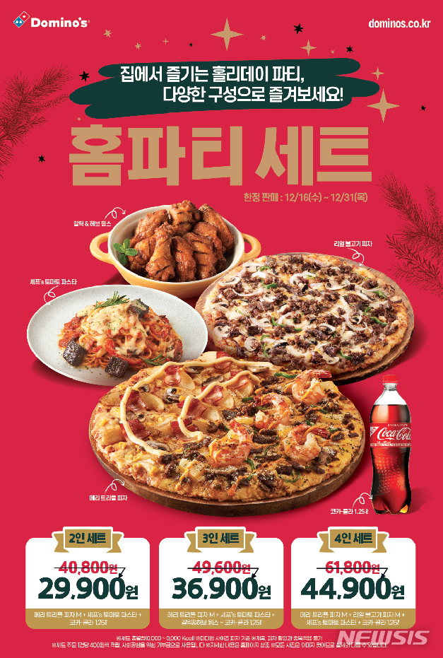 도미노피자는 오는 31일까지 30주년 마지막 한정판 '메리 트리플 피자'가 포함된 홈파티 세트 메뉴를 판매한다. 크리스마스를 맛있고, 따뜻하게 보낼 수 있도록 세트 메뉴 3종을 선보였다. 메리 트리플 피자(M), 셰프's 토마토 파스타, 코카-콜라 1.25ℓ로 구성된 '홈파티 2인 세트'는 2만9900원에 판매한다.