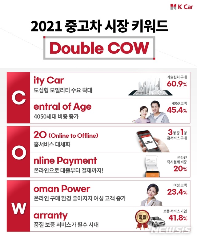 [서울=뉴시스] 박주연 기자 = 국내 최대 직영중고차 기업 케이카(K Car)가 2021년 신축년 소띠 해를 맞아 'Double COW'를 중고차 시장의 핵심 키워드로 선정했다고 29일 밝혔다.
