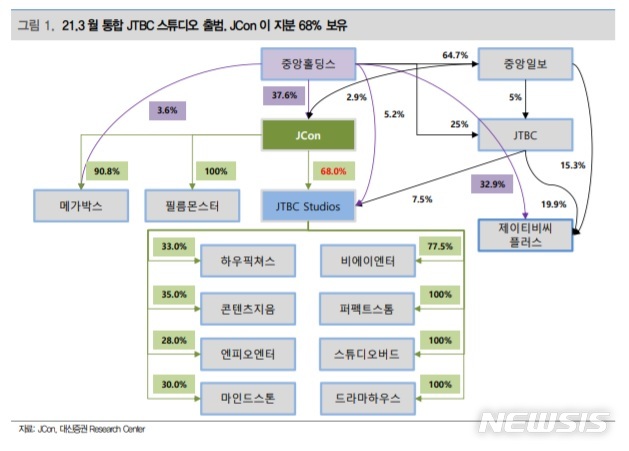 김회재 대신증권 연구원은 "JTBC스튜디오는 전일 공시를 통해 4000억원의 3자 배정 유상증자를 결정했다"며 "유상증자를 반영한 통합 JTBC스튜디오의 기업가치는 1조5000억원~1조6000억원 수준으로 추정된다"고 전했다.