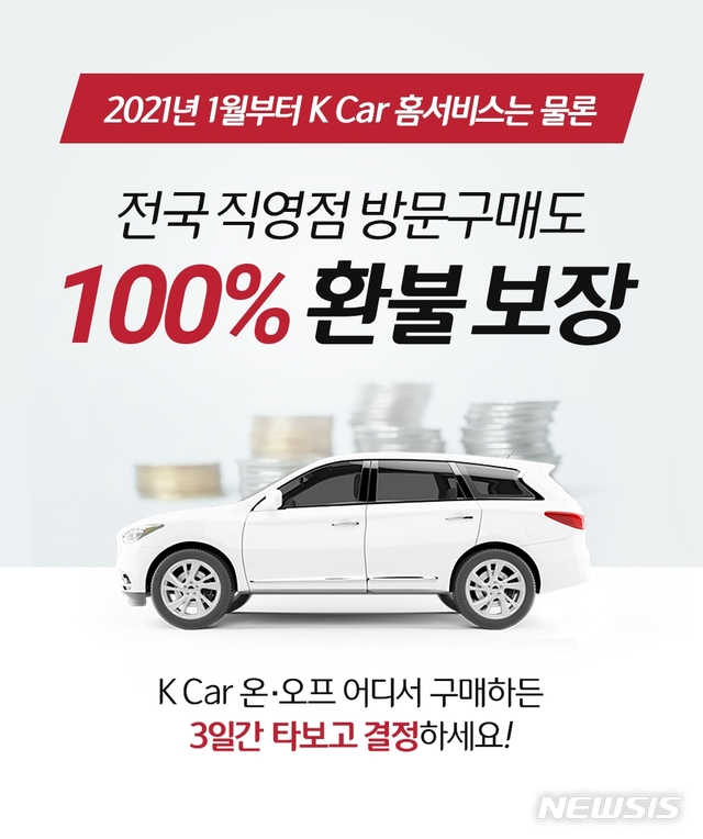[서울=뉴시스] 박주연 기자 = 직영중고차 기업 케이카(K Car)는 소비자가 차량을 구매하고 3일간 충분히 운행한 후 불만족할 때 100% 환불해주는 '3일 책임 환불제'를 이달부터 전국 직영점으로 확대 운영한다고 4일 밝혔다. 직접 차를 확인할 수 있는 오프라인 매장에서 정식으로 100% 환불제를 시행하는 것은 업계 최초다.
