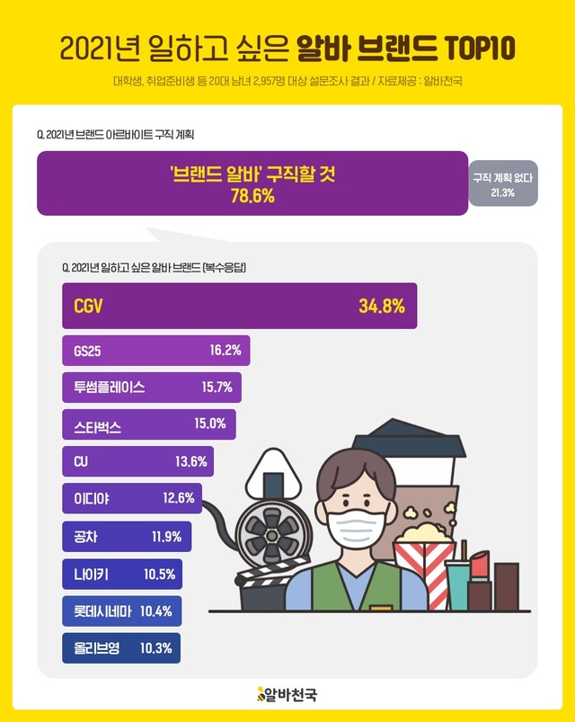[서울=뉴시스] 김종민 기자 = 구인구직 아르바이트 전문 포털 ‘알바천국’이 20대가 꼽은 2021년에 가장 일하고 싶은 알바 브랜드로 ‘CGV’가 꼽혔다고 발표했다.