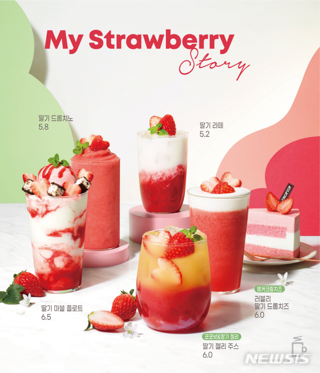 이디야커피도 '딸기 음료 3종'을 선보였다. '딸기 라떼'는 새콤달콤한 국산 딸기와 우유가 맛있게 어울린다. '딸기 복숭아 요거트 플랫치노'는 새콤한 딸기와 복숭아 요거트 플랫치노가 만나 눈과 입이 모두 즐겁다. '말랑말랑 딸기 에이드'는 딸기의 달콤함에 패션티의 향긋함과 라임이 조화된 음료다.