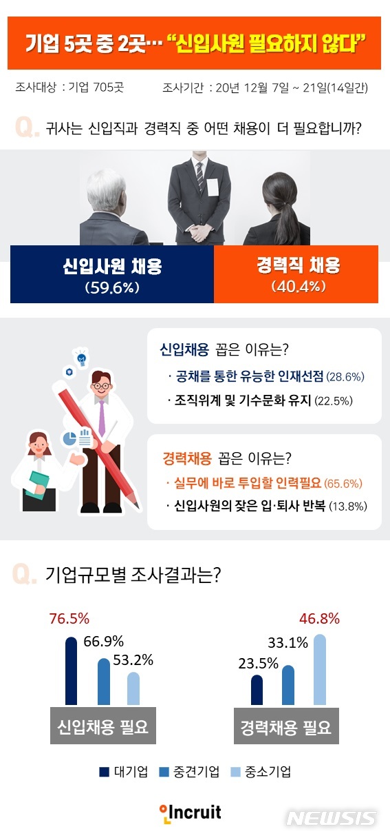 인크루트는 알바콜과 함께 기업 인사담당자를 대상으로 '2021년 대졸신입 채용동향'을 조사한 결과, '신입 및 경력사원 중 어떤 채용이 더 필요하다고 생각하는지' 묻자 응답자 40.4%는 '신입보다는 경력 및 중고신입 채용이 효율적'이라고 답했다고 27일 밝혔다. 나머지 59.6%는 '경력직과 별개로 신입사원 채용은 필요하다'고 답했다.