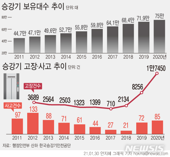 승강기 고장 통계를 집계하기 시작한 2012년 이래 가장 많다. 승강기 설치 대수가 당시 47만1403대보다 1.6배 증가한 점을 고려해도 눈에 띄게 잦은 셈이다.