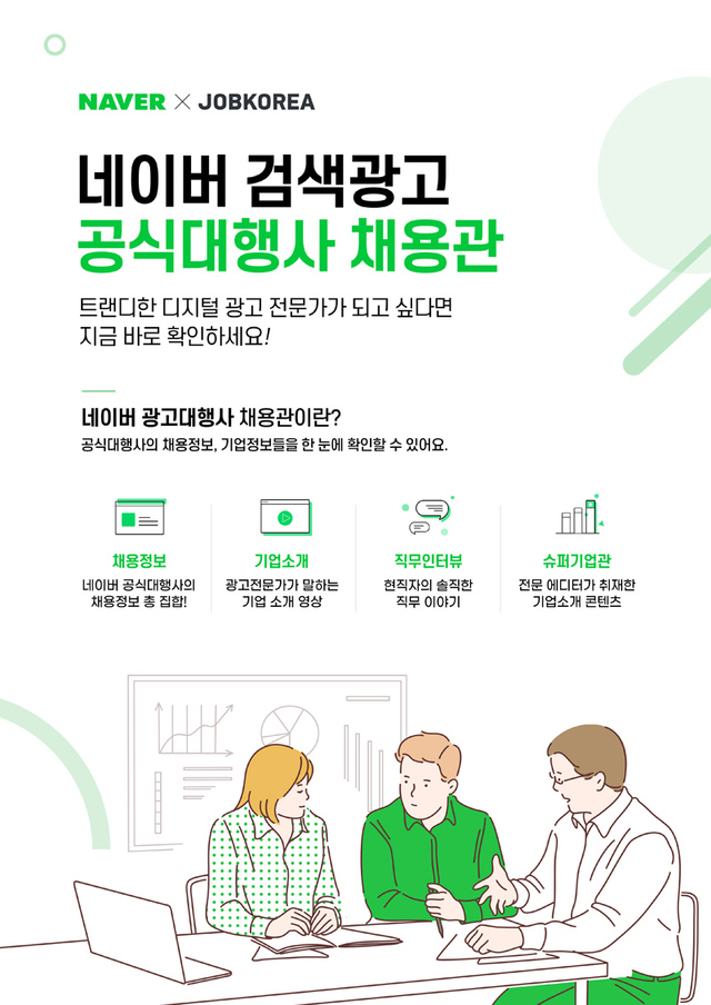 ‘네이버 검색광고 공식대행사 전문채용관’은 네이버가 직접 선정한 검색광고 공식대행사들의 채용정보를 잡코리아가 한 곳에 모아 제공하는 온라인 채용관이다. 오픈 이래 1만7000여건에 이르는 채용공고가 등록돼 누적 지원자수는 30만여명에 이른다.