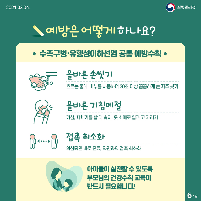아이들에게 감염병 증상이 나타나면 등원 및 등교를 하지 않고 즉시 병원을 방문한다. 아이와 접촉한 물건들은 꼼꼼하게 세척 및 소독해야 한다. 영유아의 경우 발열에 주의하며 경과를 체크한다.