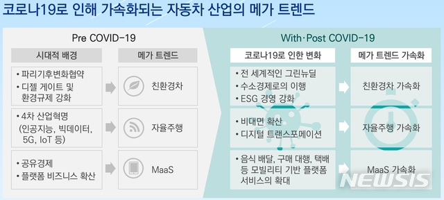 [서울=뉴시스] 류병화 기자 = 지난해 전세계 자동차 생산량과 판매량이 전년 대비 두 자릿수 이상 감소했지만 친환경차, 자율주행, 모빌리티서비스로의 패러다임 전환은 더욱 빨라지고 있다는 분석이 나왔다.