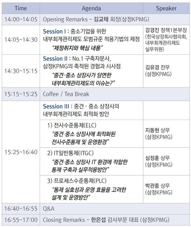 이어 지동현 삼정KPMG 상무가 중견·중소 상장사에 최적화된 전사수준통제 및 운영환경에 대해 소개하고 심정훈 삼정KPMG 상무는 중견·중소 상장사 정보기술(IT) 환경에 적합한 통제 구축과 실무적용 방안에 대해 제언한다. 마지막으로 통제 실효성과 운영 효율을 고려한 내부회계관리제도 설계 및 운영방안을 박관종 삼정KPMG 상무가 발표할 예정이다.
