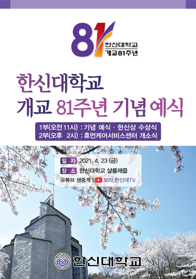 정부 코로나19 방역 지침을 준수해 행사를 진행하며, 한신대 유튜브인 ‘보라, 한신대TV’로 생중계한다.