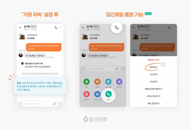 [서울=뉴시스] 손정빈 기자 = 당근마켓은 개인 전화번호 공유 없이 이웃 간 통화 기능을 추가했다고 29일 밝혔다. 채팅에서 설정한 '거래약속' 한 시간 전후로 사용할 수 있는 통화 기능이다.