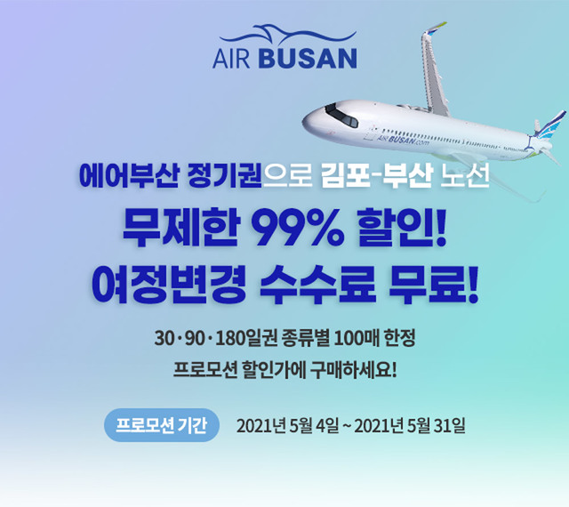 [서울=뉴시스] 이재은 기자 = 에어부산이 부산↔김포 노선을 탑승할 때마다 무제한으로 99% 할인을 받을 수 있는 정기권을 4일부터 한정 판매한다.