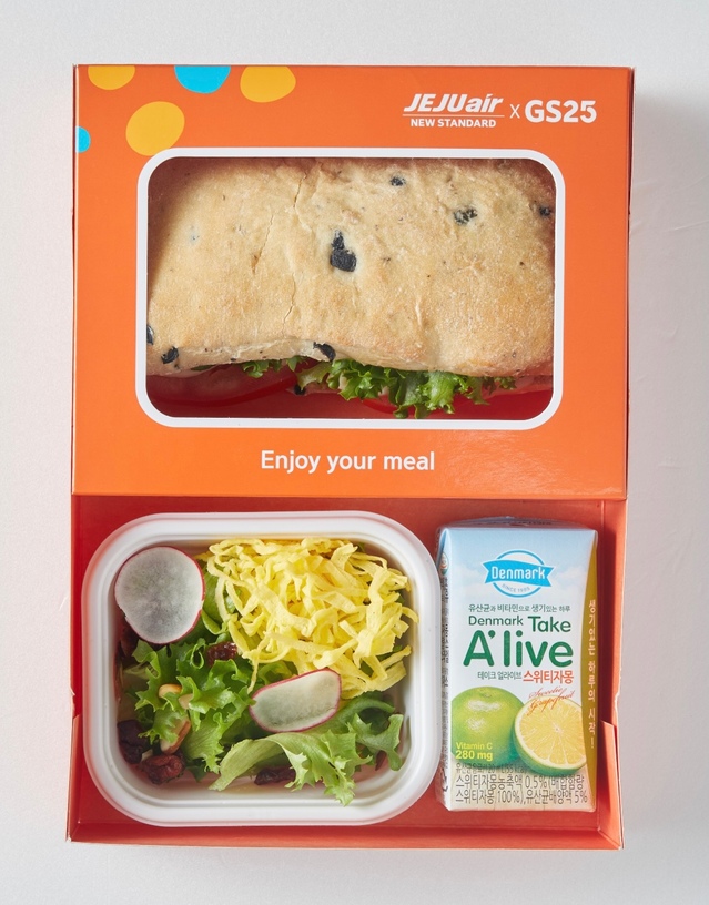 GS25 편의점에서 판매되는 ‘제주항공 x GS25 기내식 콘셉트 도시락 2종’은 치킨도시락과 샌드위치이며 샐러드와 음료가 함께 구성되어 있다. 실제 제주항공 기내식과 동일한 상자에 담겨 판매되나 AK&홍대 1층 기내식 카페 ‘여행맛’에서 판매되는 기내식과는 내용물이 다르다. 판매가격은 5500원이며 전국 GS25에서 구입이 가능하다.