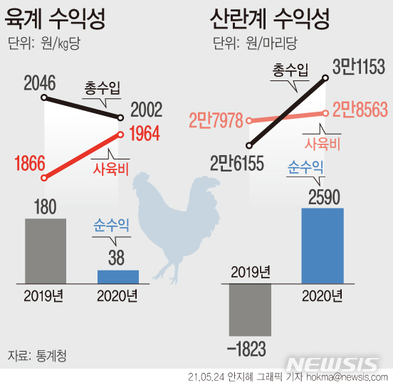 통계청 관계자는 "지난해의 경우 농가 수익성이 대체로 개선된 것으로 평가한다"며 "육계의 경우 코로나 영향으로 순수익이 줄기는 했지만 플러스를 기록하면서 흑자는 유지됐다"고 전했다.