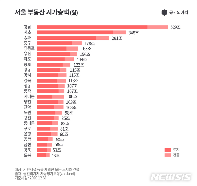 자치구별 시가총액 1위는 강남구로 시가총액이 529조원으로 나타났다. 이어 서초구 348조원, 송파구 281조원, 중구 178조원, 영등포구 163조원, 용산구 156조원, 마포구 144조원, 종로구 133조원, 강동구 115조원 등으로 나타났다.