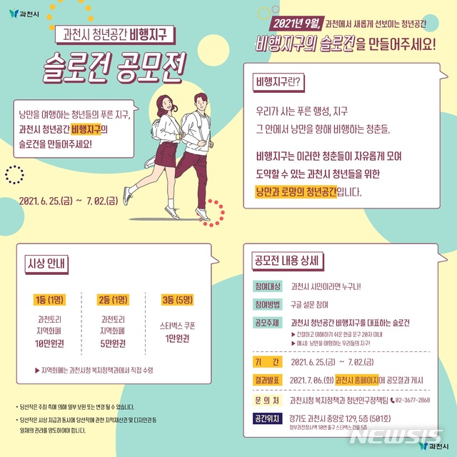 [과천=뉴시스] 박석희 기자 = 경기 과천시는 새롭게 선보일 청년 공간 ‘비행지구’의 가치와 비전을 담을 강령을 모집한다. 비행지구는 낭만을 향해 비행하는 청년들의 로망을 실현하고, 푸른 지구를 상징한다.