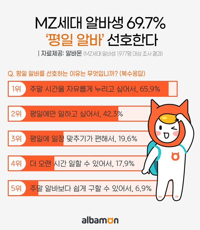 아르바이트 플랫폼 알바몬은 MZ세대 알바생 1977명을 대상으로 ‘알바 선호 시간대’ 관련 설문 조사를 실시한 결과, 응답자의 69.7%가 ‘평일 알바’를 선호한다고 답했다. 그 이유로는(복수응답) ‘주말 시간을 자유롭게 누리고 싶어서’가 65.9%의 높은 응답률로 1위에 올랐다. ‘평일에만 일하고 싶어서(42.3%)’, ‘평일에 일정 맞추기가 편해서(19.6%)’, ‘더 오랜 시간 일할 수 있어서(17.9%)’ 등 순이다.