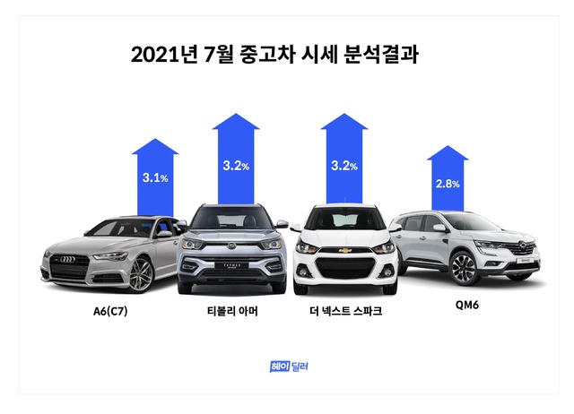 7월에 중고차 시세가 가장 많이 오른 모델은 쉐보레 '더 넥스트 스파크'와 쌍용 '티볼리 아머'였다. 두 모델 모두 전월대비 가격이 3.2%씩 상승하며 7월 중고차 시세 상승률 1위를 차지했다. 이어 르노삼성 QM6가 2.8%, 기아 더 뉴 K3가 2.6% 각각 상승했다.