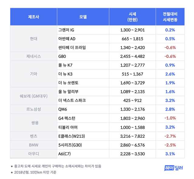 수입차 중에서는 아우디 A6(C7) 모델이 3.1% 상승했다. 반면 경쟁모델인 벤츠 E클래스(W213)는 전월에 비해 2.7% 가격이 내렸고, BMW 5시리즈(G30)도 2.5% 하락세를 나타냈다.