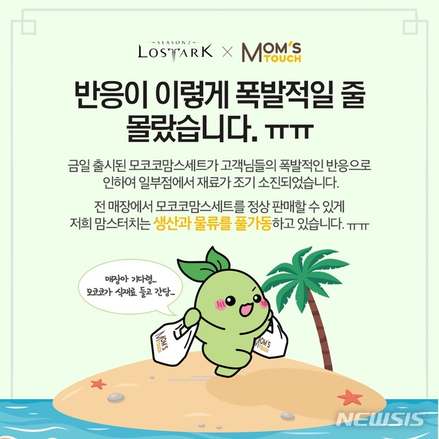맘스터치 관계자는 "모코코세트를 여러 개 구매해도 로스트아크 아이템 쿠폰은 계정당 1회 사용이 가능하다. 영리 목적으로 판매하는 것도 불가하다"며 "쿠폰 소진 시 판매를 종료해야 한다고 공지했지만, 일부 점주가 제대로 이해하지 못하고 판매한 것 같다. 소비자들이 적절한 보상을 받을 수 있도록 노력할 것"이라고 했다.
