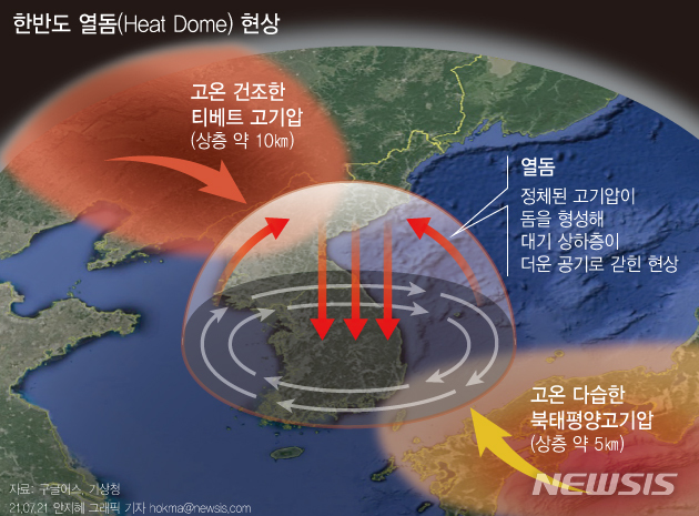우리나라는 북태평양 고기압이 자리한 상태에서 인도 북부에 위치한 티베트 고기압이 가세하며 열돔이 형성된다.