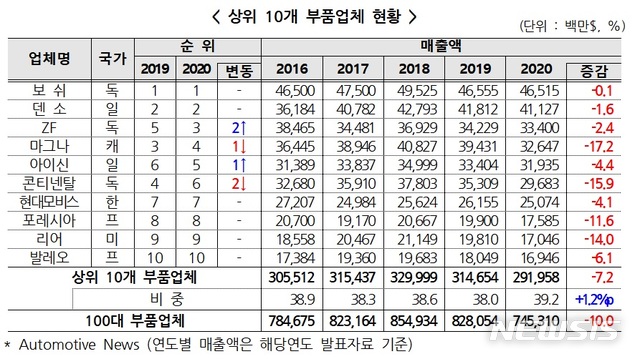 지난해 발표된 국내 업체 매출액은 전년 대비 감소폭이 –3.0%로, 일본(-8.2%), 독일(-8.6%) 등 100대 글로벌 부품업체의 매출합계 감소폭인 –10.0%보다 작아 선방했다.