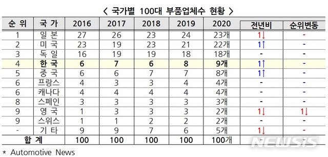 한편 지난해 국가별 100대 부품업체수 순위는 일본(23개), 미국(22개), 독일(18개), 한국(9개), 중국(8개) 순으로 나타났다.