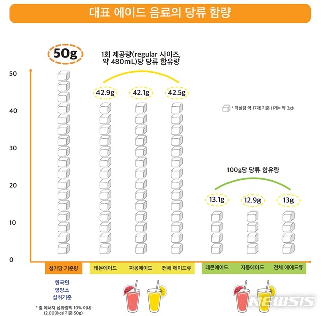 서울시는 시 보건환경연구원을 통해 프랜차이즈 에이드류의 당류 함량을 조사한 결과 이러한 결과가 나왔다고 27일 밝혔다.