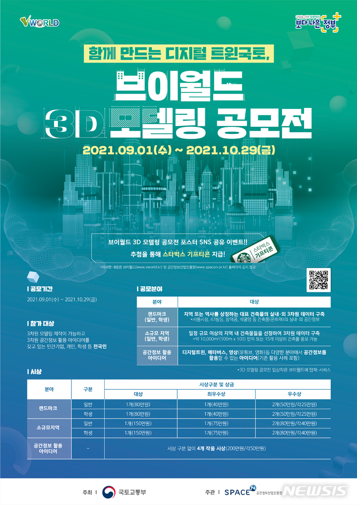 공모전은 공공·민간이 보유한 우수한 3차원 디지털 모형을 발굴해 공간정보 오픈플랫폼인 브이월드의 지도 서비스를 통해 무료로 제공함으로써 브이월드와 디지털 트윈국토에 대한 국민들의 관심을 유도하기 위한 것이다.