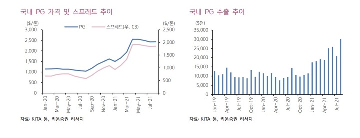 이동욱 키움증권 연구원은 PG가격 강세 지속에 대해 "건축 수요 증가로 역내·외 PO업체들의 폴리올 마진 향유가 확대된 반면 PG공급은 제한됐다. 코로나19 전이 바이러스 확대로 위생용·제약 등 USP그레이드 수요 증가에 기인한다"며 "물류 제한에 따른 비용 증가도 가격 상승 요인으로 작용한다"고 분석했다.