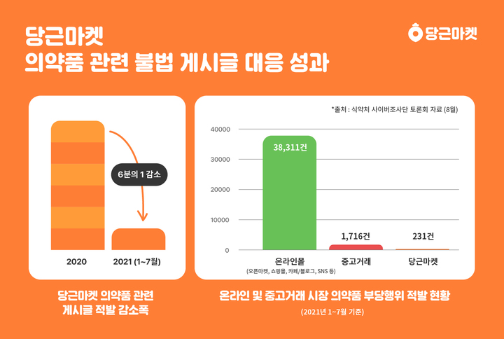 강력한 제재와 관리로 의약품 부당 거래도 대폭 줄었다. 식품의약안전처 사이버조사단이 공개한 자료에 따르면 올해 1~7월 당근마켓에서 적발된 의약품 게시글 수는 지난 한 해보다 6분의 1 수준으로 감소했다.