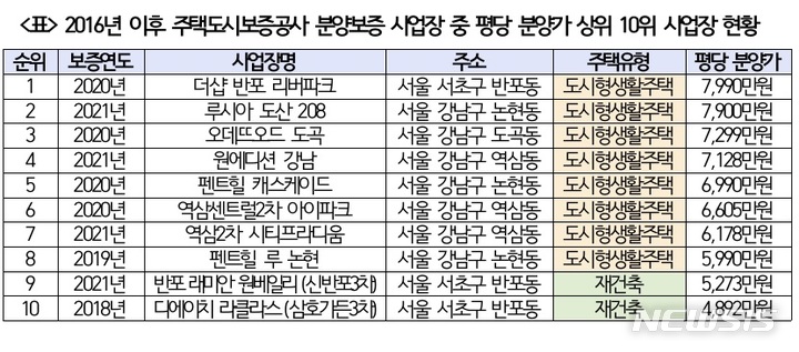 16일 국회 국토교통위원회 소속 더불어민주당 소병훈 의원이 2016년 이후 주택도시보증공사에서 분양보증서를 발급받은 1809개 사업장의 평당 분양가를 분석한 결과 3.3㎡당 분양가 상위 10위 사업장 중 상위 8개 사업장이 도시형생활주택 사업장인 것으로 확인됐다.